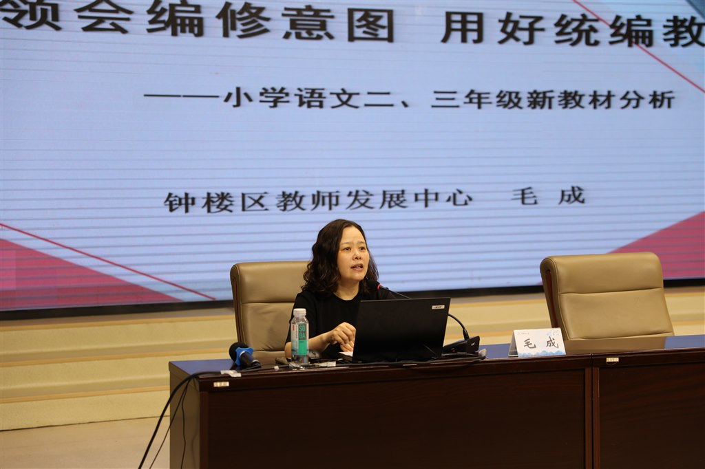 小学语文教研员,正高级教师毛成主任为全市教师作《小学语文统编版二、三年级新教材培训》。毛老师基于教材修订的理念,为教师们解析修订要点,梳理新教材的新变化,并针对如何用好新教材进行单元整体教学、识字写字教学、阅读及习作教学给出了具体建议,为教师准确把握教材立意、转变教学方式、落实立德树人根本任务提供了路径指导。