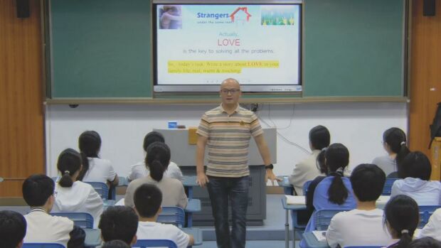 随后,江苏省奔牛高级中学顾慧艳老师带来该文本第二课时的教学展示。课堂以 “撰写个人家庭之爱的故事” 为核心任务,借助评价量表与词汇库为学生搭建表达支架,学生自主建构,并与同伴协商互助,讨论完善写作成果 — 学生自主生成的精彩故事引发现场阵阵掌声;课堂尾声,顾老师分享个人故事,将情感共鸣推向高潮,最后以 “本节课你学到了什么” 的互动提问,简洁高效地完成了课堂总结,恰到好处地实现了“学—用—悟” 的语言学习闭环。