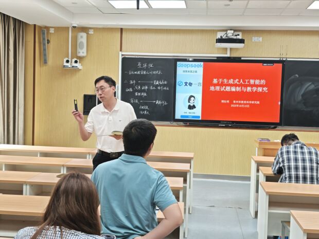 最后,地理教研员顾松明老师开设了《基于生成式人工智能的地理试题编制与教学探究》的专题讲座。他强调了地理学科的差异性与相似性思想,试题设计需融入探究元素,强调学生的思考和素养提升,提出高三地理复习教学的三个转变:从教师主讲向学生主思转变、从覆盖教材向提升素养转变、从机械刷题向精准突破转变,强调地理试题编制能力的重要性,包括试题编制素养、地理学科素养、综合能力素养等。