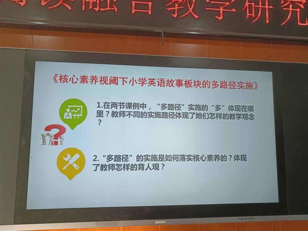 前期,徐小丽老师组织邹区实验小学及其教研共同体的老师从教学观、评价观、育人观等多角度对两节课进行了预研究。活动正式开始后,邹区实验小学司丽琴老师紧扣活动主题“核心素养视阈下小学英语故事板块的多路径实施”提出了研讨问题,让大家带着问题进行课堂观摩,引导观课教师聚焦关键教学行为展开深度思考,为后续研讨做好了充分铺垫。