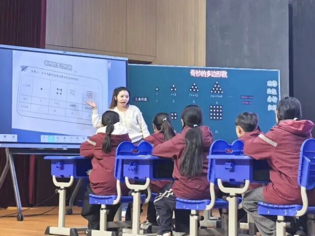 武进区星河实验小学孔子鋆老师执教公开课《奇妙的多边形数》。她以学生练习中的“规律探索”题型为载体,精心设计课堂,通过“观察—比较—分析—归纳”的探究方式,借助画点阵、列算式等多角度观察,解锁三角形数、正方形数的规律,发现两者之间的关系,引导学生直观感受数形结合的魅力,在趣味探究中提升推理能力,领略数学世界的奇妙。