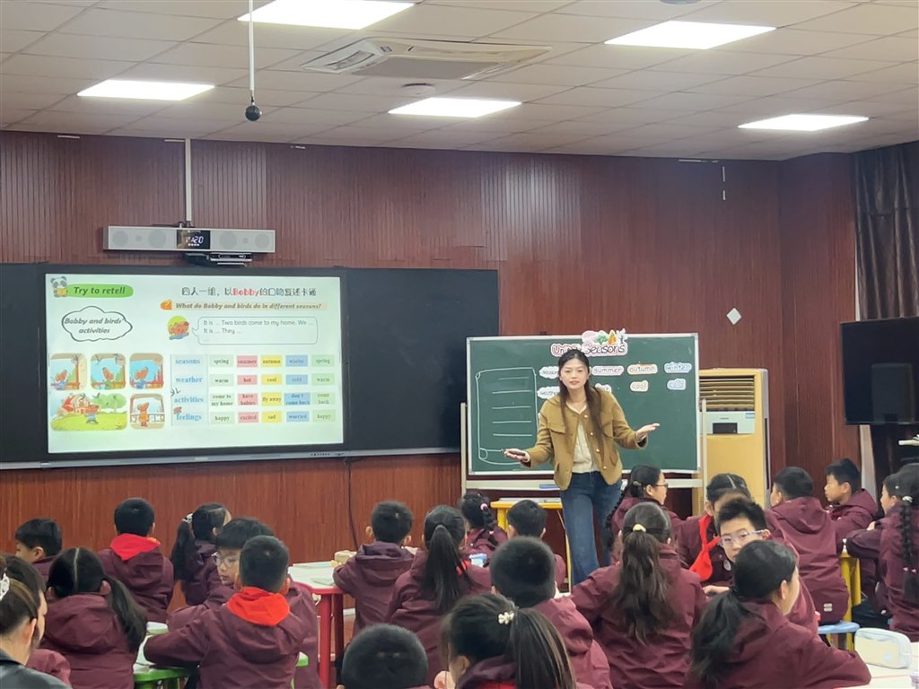 在第一课时的教学中,骆小维老师围绕“Seasons”这一主题,深度践行单元整体教学理念,突破了传统单课时教学的碎片化局限。课堂上,骆老师巧妙融汇中外诗篇,引领学生感受四季流转之美,将自然景致与季节特征生动关联,引导学生主动发现每个季节中的美好事物与快乐活动。而在cartoon time环节,学习过程更如讲述一个完整的故事,学生通过角色演绎沉浸其中,真切体会到四季更迭间蕴藏的盎然意趣。