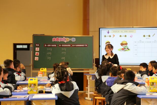 活动中,金坛区东城实验小学闫波、何希凡两位教师分别执教二年级《用方向词交流》、三年级《大家都来称一称》。两节课均以真实任务驱动,前者通过“校园小导游”情境,让学生在设计路线、介绍校园中运用方向知识,培养空间观念;后者以“质量探索”为主题,通过“估、称、拎、算”将抽象单位具象化,融入生活单位彰显数学实用性,充分体现“做中学、用中学、创中学”的课堂新样态。