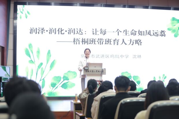 “带班方略”交流部分,常州市武进区湖塘桥第三实验小学王瀚老师阐释“发现·协作·创变”三维生态、鸣凰中学沈琳老师解读“凤鸣朝阳,梧萃英才”的梧桐班品牌的班级建设理念与实践体系,展现了科学育人的思考与创新。