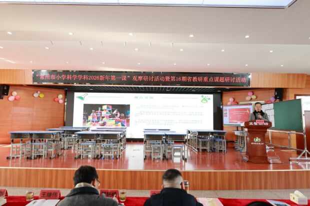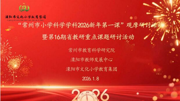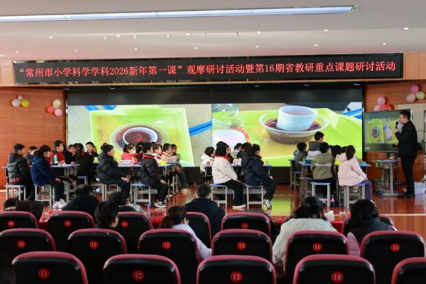 1月8日,常州市小学科学“2026新年第一课”观摩研讨暨第16期省教研重点课题研讨活动在溧阳市文化小学教育集团(燕园路校区)顺利举行。本次活动由常州市教育科学研究院组织,溧阳市教师发展中心协办,溧阳市文化小学教育集团具体承办,旨在深化新课标背景下小学科学课堂教学改革,探索学科育人新路径。来自常州市各区的小学科学教研员、骨干教师代表及滨海二实小跟岗学习团队齐聚一堂,共研共学,气氛热烈。