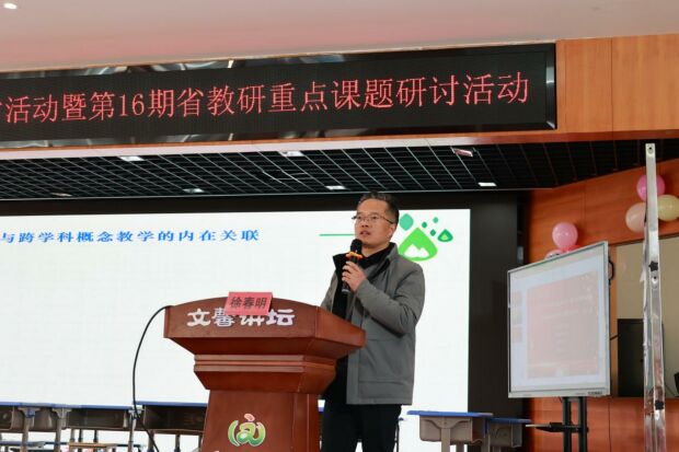 两节课后,溧阳市泓口小学徐春明校长作题为《以模型建构推进小学科学跨学科概念教学》的专题分享。徐校长结合自身多年教学与管理实践,深入浅出地阐述了模型建构在促进学科融通、提升学生科学思维方面的实施策略与思考,为与会教师提供了可借鉴的行动框架。