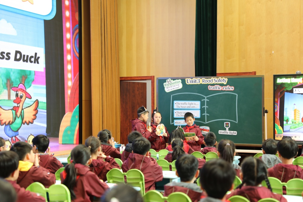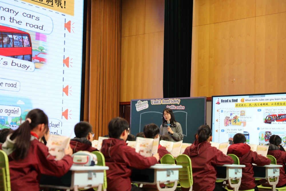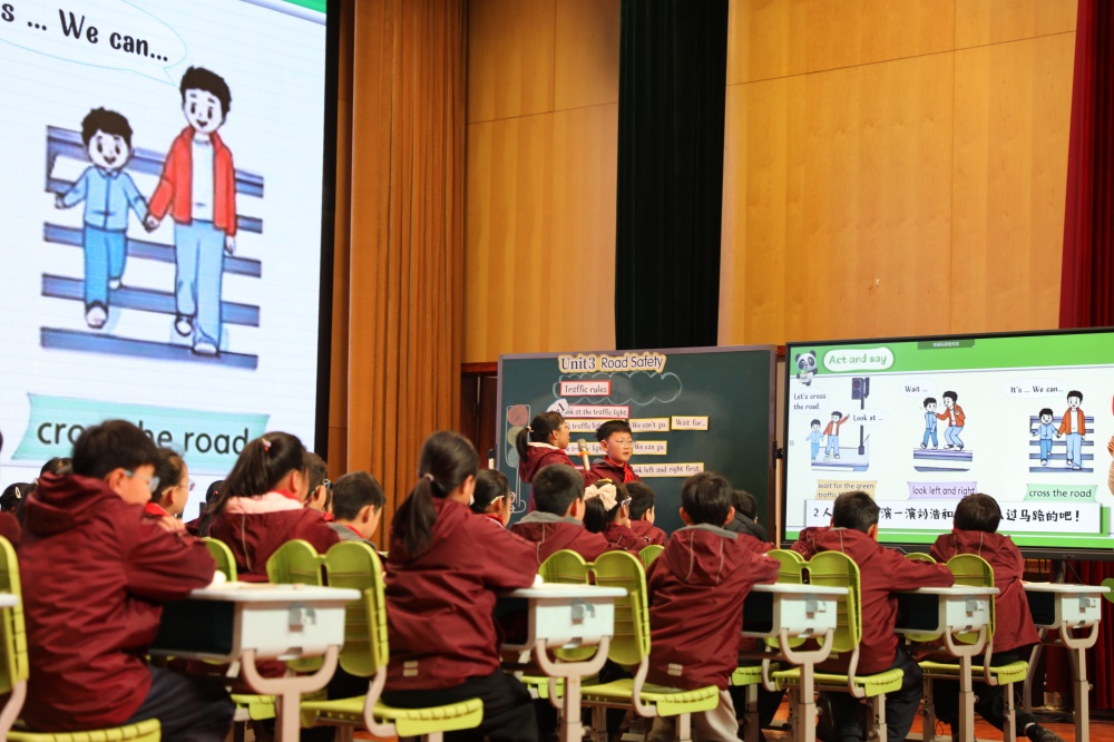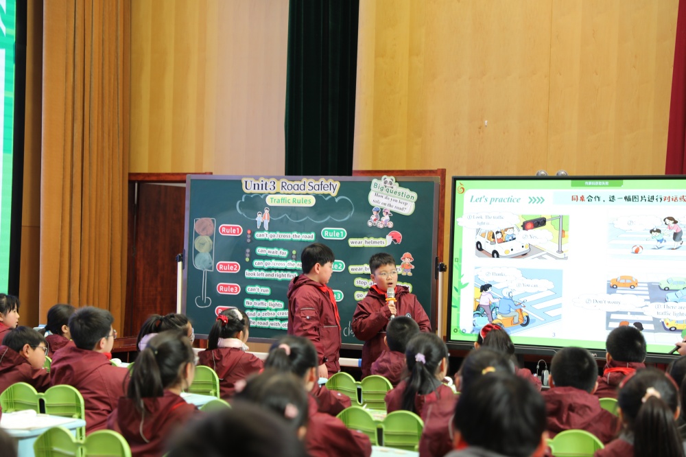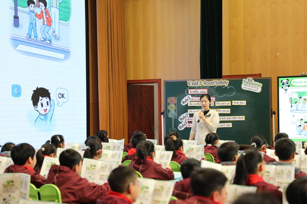常州市华润小学张宁老师执教的第三课时,作为Story time板块的延伸,进一步学习生活中的其它安全规则。上课伊始,学生以不同形式反复诵读Story time语篇。接着,通过阅读《课课练》中的语篇,引导学生了解更多过马路的交通规则。随后,借助Sound time板块的韵律诗,在趣味拼读中掌握字母“o”的发音规律,同时拓展“骑行戴头盔”等骑行者交通规则。最后,通过角色扮演活动,让学生在真实生活情境中熟练运用所学规则,进一步强化道路安全意识。