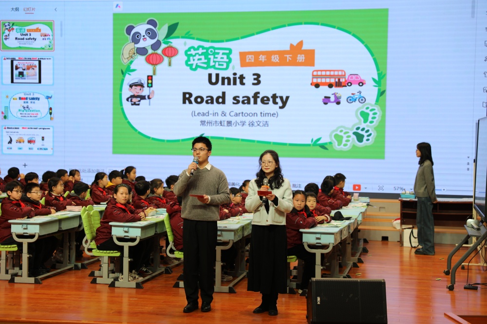 常州市虹景小学徐文洁老师执教第一课时, 授课内容为Lead-in&Cartoon time板块。徐老师以道路安全主题歌曲开启课堂,自然抛出单元核心问题 “How do you keep safe on the road?”。通过预习单反馈、交通标志竞猜、趣味词汇游戏等多元互动活动,引导学生自主掌握核心词汇、短语与基础句型;借助看视频、故事品读、分角色表演等形式梳理故事情节,让学生初步感知交通规则,建立道路安全意识。