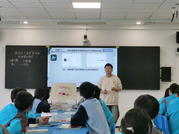 下午的课堂观摩环节分别在录播教室和报告厅同步进行,四节展示课围绕“微型空气质量检测仪的组装与使用”和“机器人中的化学智慧”两大主题展开,充分体现了“人工智能+跨学科”的教学新样态。